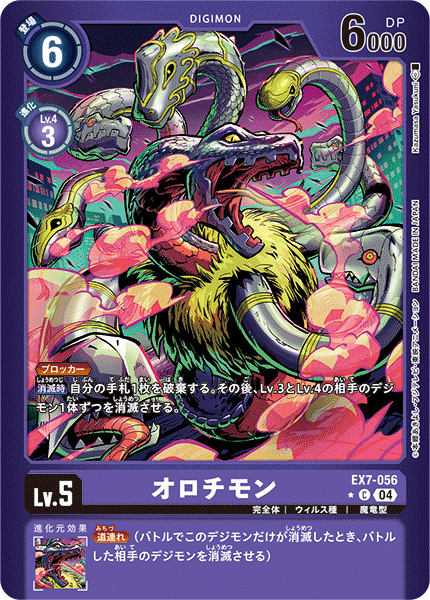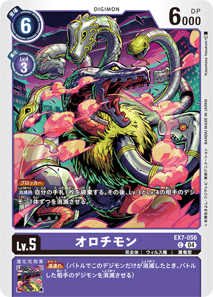 Lv.5 オロチモン EX7-056 C 完全体 | ウィルス種 | 魔竜型 ≪ブロッカー≫ 【消滅時】自分の手札1枚を破棄する。その後、Lv.3とLv.4の相手のデジモン1体ずつを消滅させる。 --- ≪道連れ≫(バトルでこのデジモンだけが消滅したとき、バトルした相手のデジモンを消滅させる)