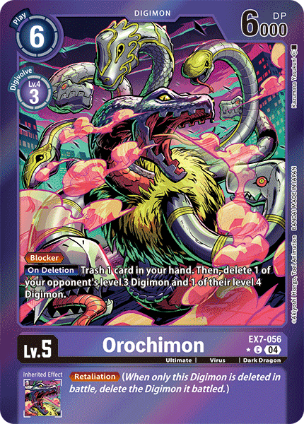 Lv.5 Orochimon EX7-056 C Ultimate | Virus | Dark Dragon <Blocker> [On Deletion] Trash 1 card in your hand. Then, delete 1 of your opponent's level 3 Digimon and 1 of their level 4 Digimon. --- <Retaliation> (When only this Digimon is deleted in battle, delete the Digimon it battled.)