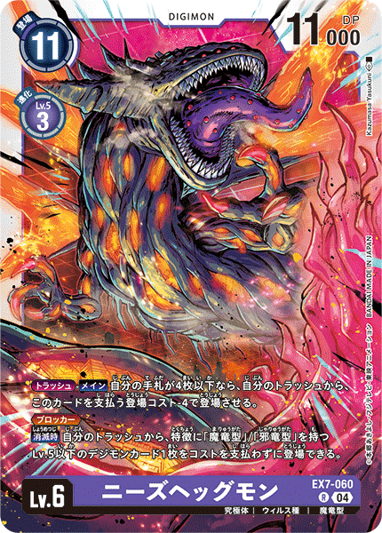 Lv.6 ニーズヘッグモン EX7-060 R 究極体 | ウィルス種 | 魔竜型 [トラッシュ]【メイン】自分の手札が4枚以下なら、自分のトラッシュから、このカードを支払う登場コスト-4で登場させる。 ≪ブロッカー≫ 【消滅時】自分のトラッシュから、特徴に「魔竜型」/「邪竜型」を持つLv.5以下のデジモンカード1枚をコストを支払わずに登場できる。 ---