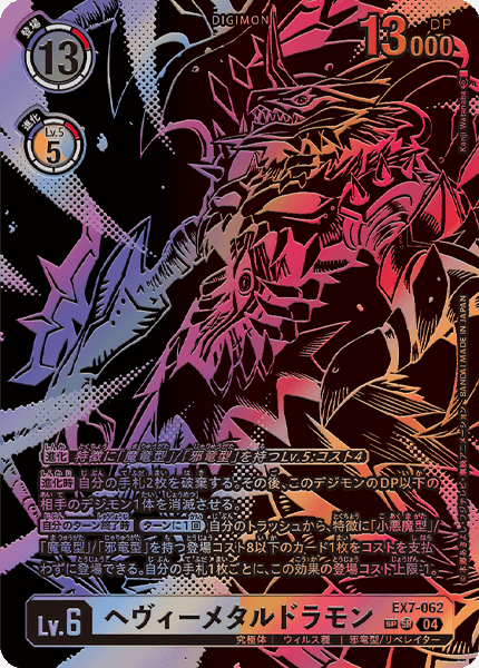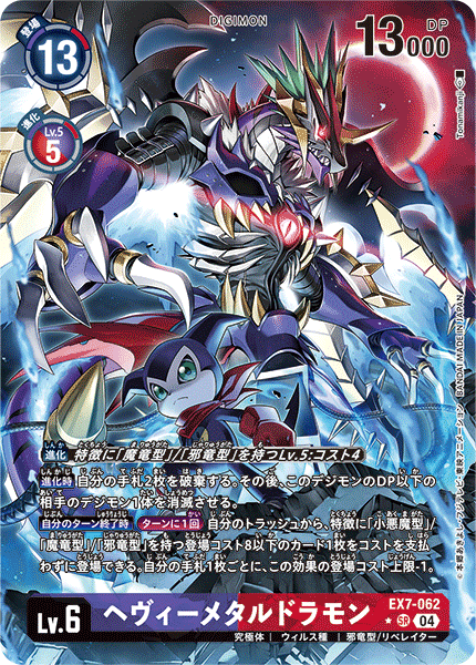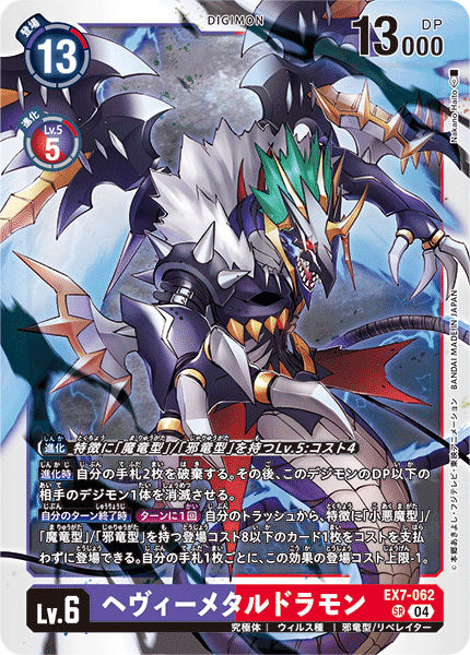 Lv.6 HeavyMetaldramon EX7-062 SR mega | Virus | Evil Dragon/LIBERATOR [Digivolve] Lv.5 w/[Dark Dragon]/[Evil Dragon] trait: Cost 4 [When Digivolving] Trash 2 cards in your hand. Then, delete 1 of your opponent's Digimon with as much or less DP as this Digimon. [End of Your Turn] [Once Per Turn] You may play 1 card with the [Evil], [Dark Dragon] or [Evil Dragon] trait and a play cost of 8 or less from your trash without paying the cost. For each card in your hand, reduce 1 from this effect's play cost maximum.