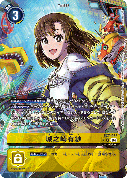 城之崎有紗 EX7-063 R リベレイター 【自分のメインフェイズ開始時】相手のデジモンがいるなら、メモリー+1。 【お互いのターン】自分のトークンか特徴に「パペット型」を持つ自分のデジモンが消滅したとき、このテイマーをレストさせることで、自分の手札から、特徴に「パペット型」を持つLv.3のデジモンカード1枚をコストを支払わずに登場できる。 --- 【セキュリティ】このカードをコストを支払わずに登場させる。