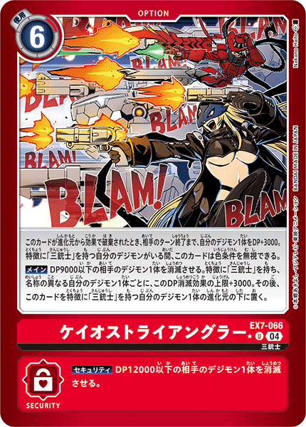 ケイオストライアングラー EX7-066 U 三銃士 このカードが進化元から効果で破棄されたとき、相手のターン終了まで、自分のデジモン1体をDP+3000。 特徴に「三銃士」を持つ自分のデジモンがいる間、このカードは色条件を無視できる。 【メイン】DP9000以下の相手のデジモン1体を消滅させる。特徴に「三銃士」を持ち、名称の異なる自分のデジモン1体ごとに、このDP消滅効果の上限+3000。その後、このカードを特徴に「三銃士」を持つ自分のデジモン1体の進化元の下に置く。 --- 【セキュリティ】DP12000以下の相手のデジモン1体を消滅させる。