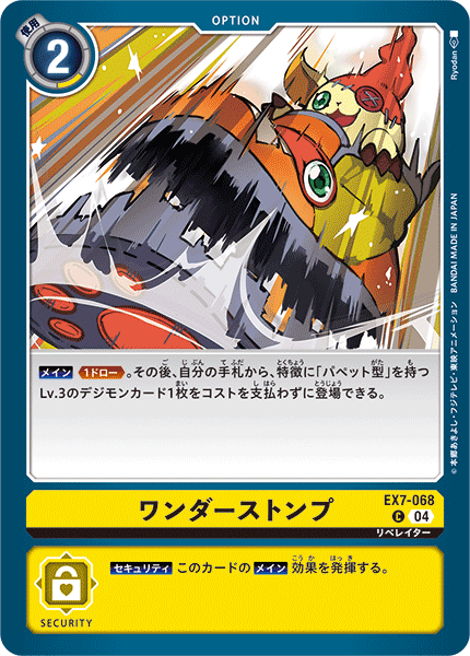 Wonder Stomp EX7-068 C LIBERATOR [Main] <Draw 1>. Then, you may play 1 level 3 Digimon card with the [Puppet] trait from your hand without paying the cost. --- [Security] Activate this card's [Main] effects.