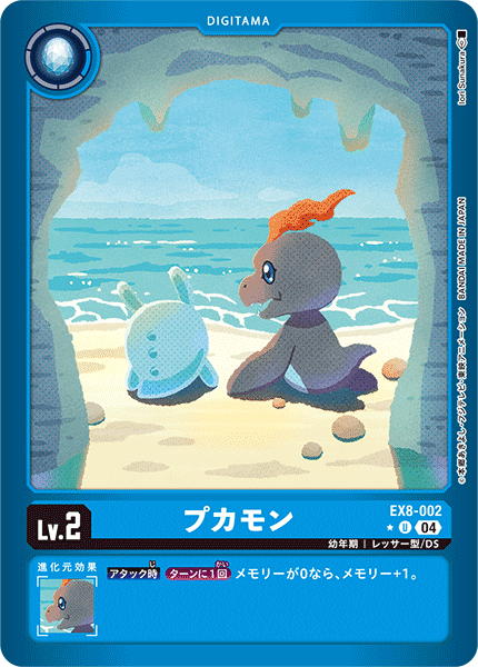 Lv.2 プカモン EX8-002 U 幼年期 | レッサー型/DS --- 【アタック時】[ターンに1回]メモリーが0なら、メモリー+1。