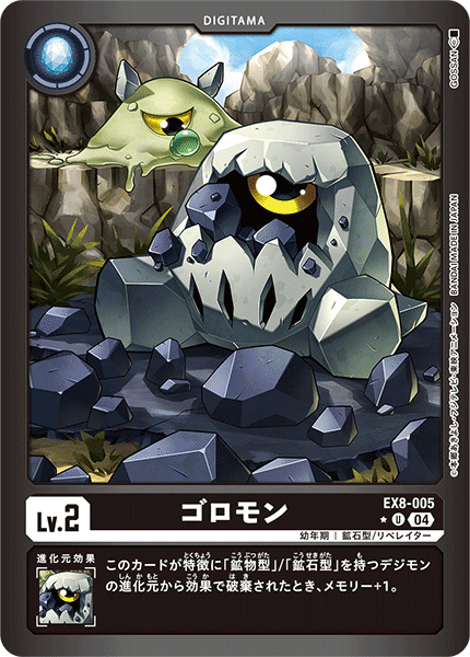 Lv.2 ゴロモン EX8-005 U 幼年期 | 鉱石型/リベレイター --- このカードが特徴に「鉱物型」/「鉱石型」を持つデジモンの進化元から効果で破棄されたとき、メモリー+1。