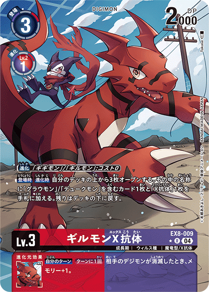 Lv.3 ギルモンX抗体 EX8-009 R 成長期 | ウィルス種 | 魔竜型/X抗体 【登場時】【進化時】自分のデッキの上から3枚オープンする。その中の名称に「グラウモン」/「デュークモン」を含むカード1枚と「X抗体」1枚を手札に加える。残りはデッキの下に戻す。 --- 【自分のターン】[ターンに1回]相手のデジモンが消滅したとき、メモリー+1。