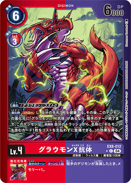 Lv.4 グラウモンX抗体 EX8-012 C 成熟期 | ウィルス種 | 魔竜型/X抗体 【進化時】≪1ドロー≫し、自分の手札1枚を破棄する。その後、このデジモンの進化元に「グラウモン」/「X抗体」があるなら、相手のターン終了まで、このデジモンは「【消滅時】自分のトラッシュから、名称に「ギルモン」を含むカード1枚をコストを支払わずに登場できる。」の効果を得る。 --- 【自分のターン】[ターンに1回]相手のデジモンが消滅したとき、メモリー+1。