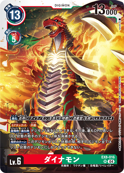 Lv.6 ダイナモン EX8-016 SR 究極体 | ワクチン種 | 恐竜型/リベレイター ≪Sアタック+1≫≪不屈≫ 【登場時】【進化時】デジモン1体をレストできる。その後、最もDPの低いレスト状態の相手のデジモン1体を消滅させる。 【相手のターン】このデジモンがレスト状態の間、相手のデジモン全てはレスト状態のデジモンにしかアタックできない。 ---