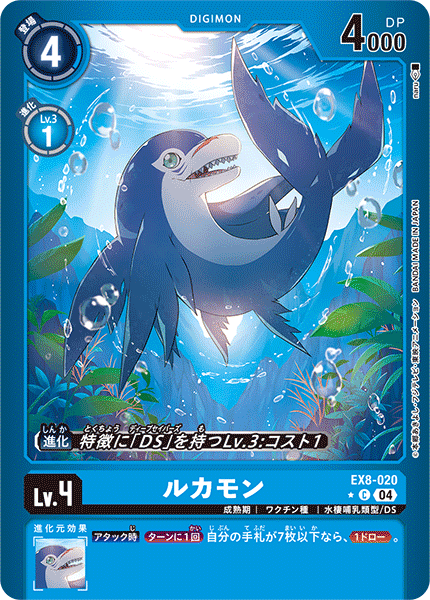 Lv.4 ルカモン EX8-020 C 成熟期 | ワクチン種 | 水棲哺乳類型/DS --- 【アタック時】[ターンに1回]自分の手札が7枚以下なら、≪1ドロー≫。