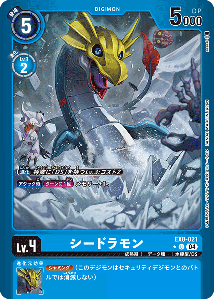 Lv.4 Seadramon EX8-021 U Champion | Data | Aquatic/DS [When Attacking] [Once Per Turn] Gain 1 memory. --- <Jamming> (This Digimon can't be deleted in battles against Security Digimon.)