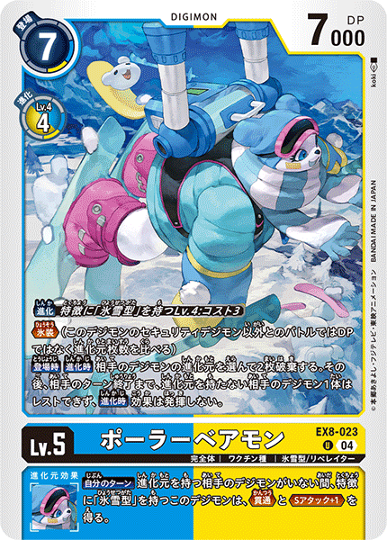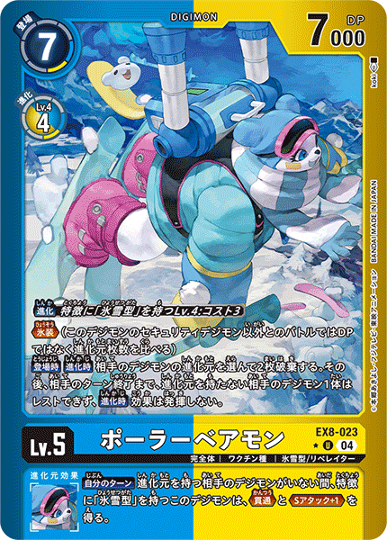 Lv.5 ポーラーベアモン EX8-023 U 完全体 | ワクチン種 | 氷雪型/リベレイター ≪氷装≫(このデジモンのセキュリティデジモン以外とのバトルではDPではなく進化元枚数を比べる) 【登場時】【進化時】相手のデジモンの進化元を選んで2枚破棄する。その後、相手のターン終了まで、進化元を持たない相手のデジモン1体はレストできず、【進化時】効果は発揮しない。 --- 【自分のターン】進化元を持つ相手のデジモンがいない間、特徴に「氷雪型」を持つこのデジモンは、≪貫通≫と≪Sアタック+1≫を得る。