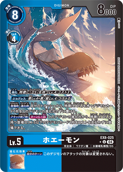 [Your Turn] This Digimon's attack target can't be switched.Lv.5 ホエーモン EX8-025 U 完全体 | ワクチン種 | 水棲哺乳類型/DS 【登場時】【進化時】自分のトラッシュから、特徴に「DS」を持つデジモンカード1枚をこのデジモンの進化元の下に置ける。 【アタック終了時】[ターンに1回]このデジモンの進化元から、特徴に「DS」を持つ登場コスト5以下のデジモンカード1枚をコストを支払わずに登場できる。 --- 【自分のターン】このデジモンのアタックの対象は変更されない。