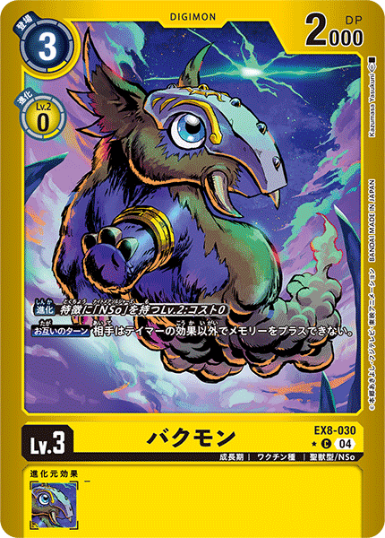 Lv.3 バクモン EX8-030 C 成長期 | ワクチン種 | 聖獣型/NSo 【お互いのターン】相手はテイマーの効果以外でメモリーをプラスできない。 ---