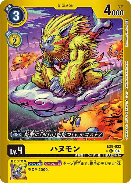 Lv.4 ハヌモン EX8-032 C 成熟期 | ワクチン種 | 獣人型/NSo --- 【アタック時】[ターンに1回]ターン終了まで、相手のデジモン1体をDP-2000。