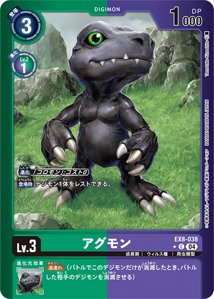 Lv.3 アグモン EX8-038 C 成長期 | ウィルス種 | 爬虫類型 【登場時】デジモン1体をレストできる。 --- ≪道連れ≫(バトルでこのデジモンだけが消滅したとき、バトルした相手のデジモンを消滅させる)