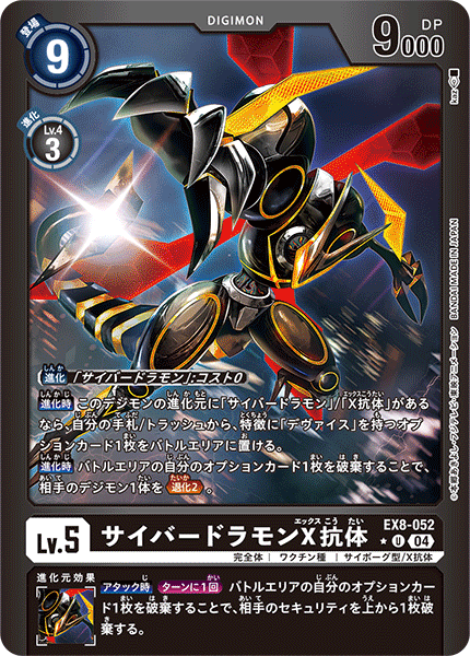 Lv.5 Cyberdramon (X Antibody) EX8-052 U Ultimate | Vaccine | Cyborg/X Antibody [Digivolve] [Cyberdramon]: Cost 0 [When Digivolving] If [Cyberdramon] or [X Antibody] is in this Digimon's digivolution cards, you may place 1 Option card with the [Device] trait from your hand or trash in the battle area. [When Digivolving] By trashing 1 of your Option cards in the battle area, <De-Digivolve 2> 1 of your opponent's Digimon. --- [When Attacking] [Once Per Turn] By trashing 1 of your Option cards in the battle area, trash your opponent's top security card.