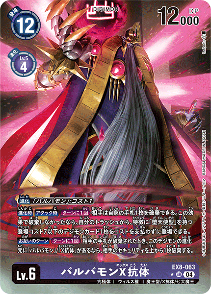 Lv.6 バルバモンX抗体 EX8-063 SR 究極体 | ウィルス種 | 魔王型/X抗体/七大魔王 【進化時】【アタック時】[ターンに1回]相手は自身の手札1枚を破棄できる。この効果で破棄しなかったなら、自分のトラッシュから、特徴に「堕天使型」を持つ登場コスト7以下のデジモンカード1枚をコストを支払わずに登場できる。 【お互いのターン】[ターンに1回]相手の手札が破棄されたとき、このデジモンの進化元に「バルバモン」/「X抗体」があるなら、相手のセキュリティを上から1枚破棄する。 ---