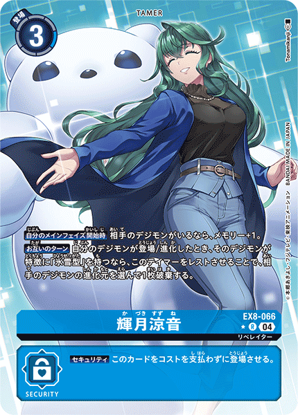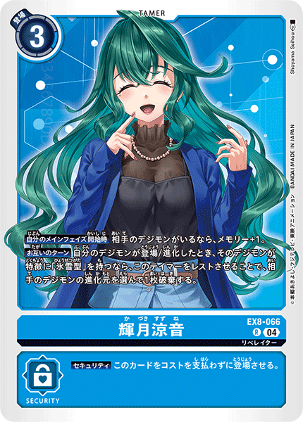 輝月涼音 EX8-066 R リベレイター 【自分のメインフェイズ開始時】相手のデジモンがいるなら、メモリー+1。 【お互いのターン】自分のデジモンが登場/進化したとき、そのデジモンが特徴に「氷雪型」を持つなら、このテイマーをレストさせることで、相手のデジモンの進化元を選んで1枚破棄する。 --- 【セキュリティ】このカードをコストを支払わずに登場させる。