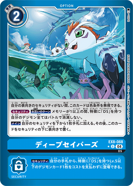 Deep Savers EX8-068 U DS While you have no face-up security cards, you can ignore this card's color requirements. (Security) [All Turns] While you have 1 or more memory, none of your [DS] trait Digimon can be deleted in battle. [Main] Add your bottom security card to the hand. Then, place this card face up as the bottom security card. --- [Security] You may play 1 level 5 or lower Digimon with the [DS] trait from your hand without paying the cost.