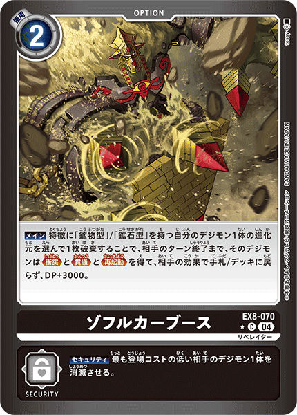 ゾフルカーブース EX8-070 C リベレイター 【メイン】特徴に「鉱物型」/「鉱石型」を持つ自分のデジモン1体の進化元を選んで1枚破棄することで、相手のターン終了まで、そのデジモンは≪衝突≫と≪貫通≫と≪再起動≫を得て、相手の効果で手札/デッキに戻らず、DP+3000。 --- 【セキュリティ】最も登場コストの低い相手のデジモン1体を消滅させる。