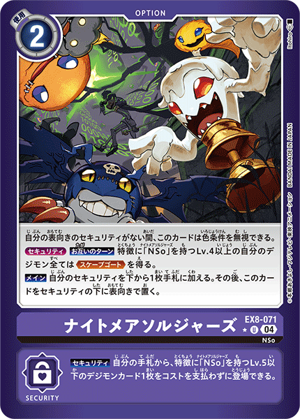 ナイトメアソルジャーズ EX8-071 U NSo 自分の表向きのセキュリティがない間、このカードは色条件を無視できる。 [セキュリティ]【お互いのターン】特徴に「NSo」を持つLv.4以上の自分のデジモン全ては≪スケープゴート≫を得る。 【メイン】自分のセキュリティを下から1枚手札に加える。その後、このカードをセキュリティの下に表向きで置く。 --- 【セキュリティ】自分の手札から、特徴に「NSo」を持つLv.5以下のデジモンカード1枚をコストを支払わずに登場できる。