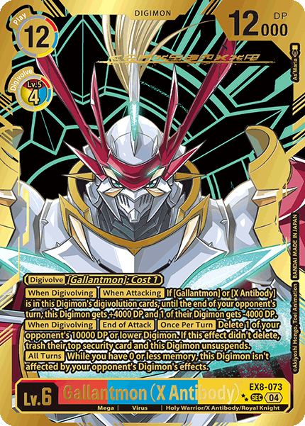 Lv.6 Gallantmon (X Antibody) EX8-073 SEC mega | Virus | Holy Warrior/X Antibody/Royal Knight [Digivolve] [Gallantmon]: Cost 1 [When Digivolving] [When Attacking] If [Gallantmon] or [X Antibody] is in this Digimon's digivolution cards, this Digimon gets +4000 DP and 1 of your opponent's Digimon gets -4000 DP until the end of their turn. [When Digivolving] [End of Attack] [Once Per Turn] Delete 1 of your opponent's Digimon with 10000 DP or less. If this didn't delete, trash your opponent's top security card and this Digimon unsuspends. [All Turns] While you have 0 or less memory, this Digimon isn't affected by the effects of your opponent's Digimon.