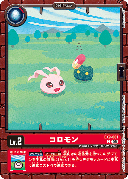 Lv.2 コロモン EX9-001 C 幼年期 | レッサー型/DM/Ver.1 --- 【アタック時】[ターンに1回]裏向きの進化元を持つこのデジモンを手札の特徴に「Ver.1」を持つデジモンカードに支払う進化コスト-1で進化できる。