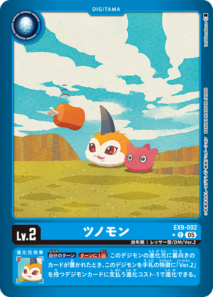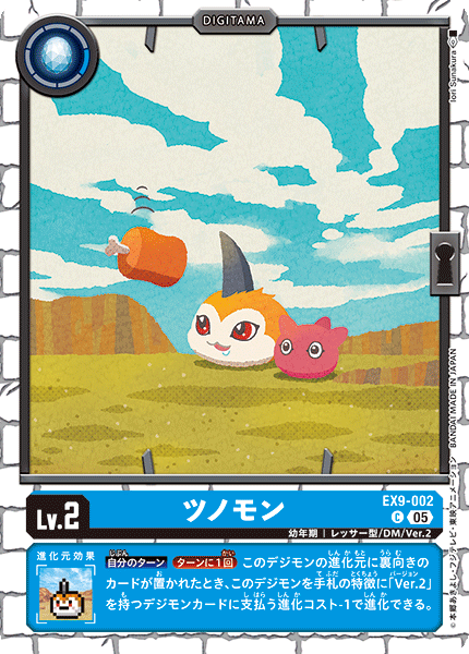 Lv.2 ツノモン EX9-002 C 幼年期 | レッサー型/DM/Ver.2 --- 【自分のターン】[ターンに1回]このデジモンの進化元に裏向きのカードが置かれたとき、このデジモンを手札の特徴に「Ver.2」を持つデジモンカードに支払う進化コスト-1で進化できる。