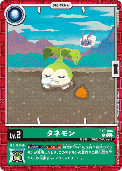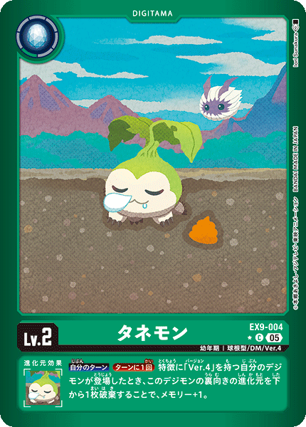 Lv.2 タネモン EX9-004 C 幼年期 | 球根型/DM/Ver.4 --- 【自分のターン】[ターンに1回]特徴に「Ver.4」を持つ自分のデジモンが登場したとき、このデジモンの裏向きの進化元を下から1枚破棄することで、メモリー+1。