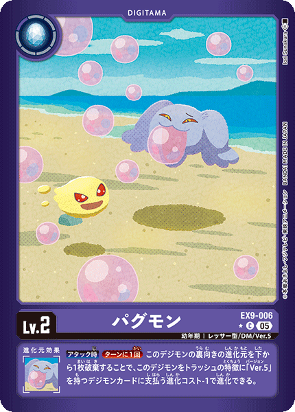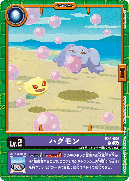 Lv.2 パグモン EX9-006 C 幼年期 | レッサー型/DM/Ver.5 --- 【アタック時】[ターンに1回]このデジモンの裏向きの進化元を下から1枚破棄することで、このデジモンをトラッシュの特徴に「Ver.5」を持つデジモンカードに支払う進化コスト-1で進化できる。