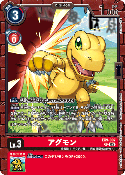 Lv.3 アグモン EX9-007 R 成長期 | ワクチン種 | 爬虫類型/DM/Ver.1 【登場時】自分のデッキの上から3枚オープンする。その中の特徴に「DM」を持つカード1枚を手札に加え、特徴に「Ver.1」を持つカード1枚を特徴に「DM」を持つ自分のデジモンの進化元の下に裏向きで置く。残りはデッキの下に戻す。 --- 【自分のターン】このデジモンをDP+2000。