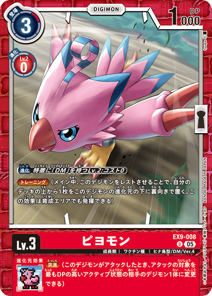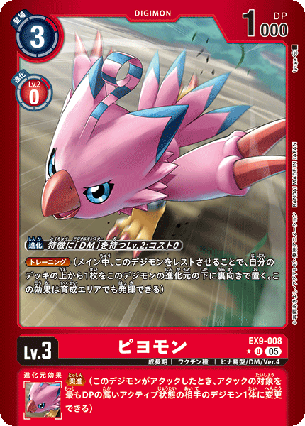 Lv.3 ピヨモン EX9-008 U 成長期 | ワクチン種 | ヒナ鳥型/DM/Ver.4 ≪トレーニング≫(メイン中、このデジモンをレストさせることで、自分のデッキの上から1枚をこのデジモンの進化元の下に裏向きで置く。この効果は育成エリアでも発揮できる) --- ≪突進≫(このデジモンがアタックしたとき、アタックの対象を最もDPの高いアクティブ状態の相手のデジモン1体に変更できる)