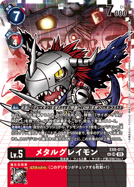 Lv.5 メタルグレイモン EX9-011 SR 完全体 | ウィルス種 | サイボーグ型/DM/Ver.1 このカードが登場するとき、自分の手札から、特徴に「サイボーグ型」/「Ver.1」を持つカード1枚を破棄することで、支払う登場コスト-2。 【登場時】【進化時】自分のトラッシュから、デジモンカード1枚をこのデジモンの進化元の下に裏向きで置くことで、DP合計5000まで、相手のデジモンを消滅させる。このデジモンの裏向きの進化元1枚ごとに、この効果のDP上限+2000。 --- ≪Sアタック+1≫(このデジモンがチェックする枚数+1)