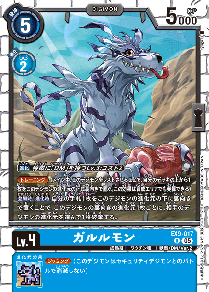Lv.4 ガルルモン EX9-017 U 成熟期 | ワクチン種 | 獣型/DM/Ver.2 ≪トレーニング≫(メイン中、このデジモンをレストさせることで、自分のデッキの上から1枚をこのデジモンの進化元の下に裏向きで置く。この効果は育成エリアでも発揮できる) 【登場時】【進化時】自分の手札1枚をこのデジモンの進化元の下に裏向きで置くことで、このデジモンの裏向きの進化元1枚ごとに、相手のデジモンの進化元を選んで1枚破棄する。 --- ≪ジャミング≫(このデジモンはセキュリティデジモンとのバトルで消滅しない)