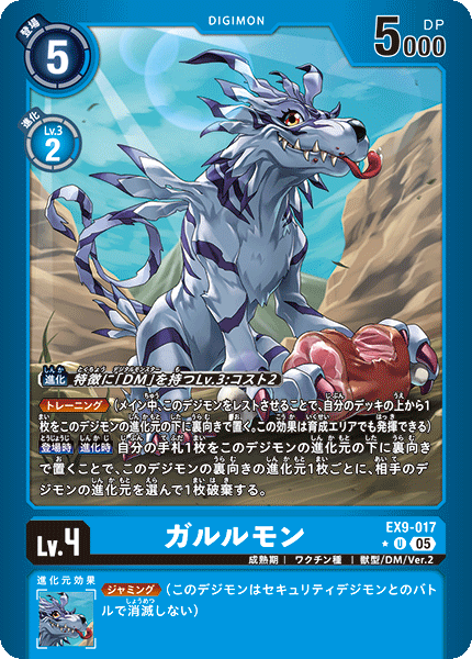 Lv.4 Garurumon EX9-017 U Champion | Vaccine | Beast/DM/Ver.2 [Digivolve] Lv.3 w/[DM] trait: Cost 2 <Training> (In the main phase, by suspending this Digimon, place your deck's top card face down as this Digimon's bottom digivolution card. This effect can also activate in the breeding area.) [On Play] [When Digivolving] By placing 1 card in your hand face down as this Digimon's bottom digivolution card, for each of its face-down digivolution cards, trash any 1 digivolution card from your opponent's Digimon. --- <Jamming> (This Digimon can't be deleted in battles against Security Digimon.)