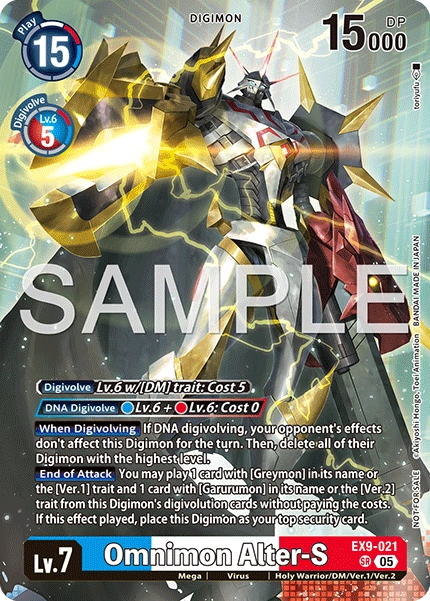 Lv.7 Omnimon Alter-S EX9-021 SR Mega | Virus | Holy Warrior/DM/Ver.1/Ver.2 [When Digivolving] If DNA digivolving, your opponent's Digimon's effects don't affect this Digimon for the turn. Then, delete all of their Digimon with the highest level. [End of Attack] You may play 1 card with [Greymon] in its name or the [Ver.1] trait and 1 card with [Garurumon] in its name or the [Ver.2] trait from this Digimon's digivolution cards without paying the costs. If this effect played, place this Digimon as your top security card. ---