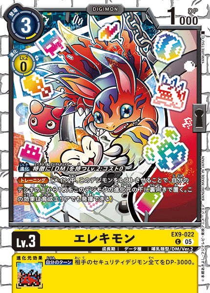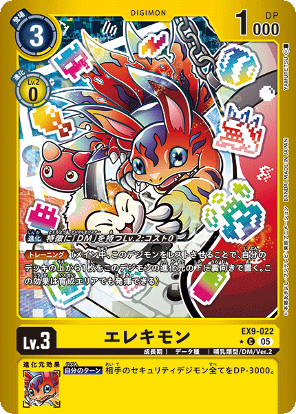 Lv.3 エレキモン EX9-022 C 成長期 | データ種 | 哺乳類型/DM/Ver.2 ≪トレーニング≫(メイン中、このデジモンをレストさせることで、自分のデッキの上から1枚をこのデジモンの進化元の下に裏向きで置く。この効果は育成エリアでも発揮できる) --- 【自分のターン】相手のセキュリティデジモン全てをDP-3000。