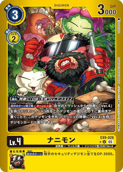 Lv.4 Nanimon EX9-028 U Champion | Virus | Invader/DM/Ver.4 [Digivolve] Lv.3 w/[DM] trait: Cost 2 [End of Your Turn] [Once Per Turn] By placing 3 Digimon cards with the [Ver.4] trait from your trash face down as this Digimon's bottom digivolution cards, it may digivolve into a Digimon card with the [Ver.4] trait in the hand or trash. --- [Your Turn] All of your opponent's Security Digimon get -3000 DP.