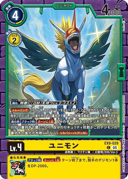 Lv.4 Unimon EX9-029 C champion | Vaccine | Mythical Beast/DM/Ver.3 [Digivolve] Lv.3 w/[DM] trait: Cost 2 <Training> [When Digivolving] [When Attacking] [Once Per Turn] By placing 1 card in your hand face down as this Digimon's bottom digivolution card, if you have as many or fewer security cards as this Digimon has face-down digivolution cards, <Recovery +1 (Deck)>. --- [When Attacking] [Once Per Turn] 1 of your opponent's Digimon gets -2000 DP for the turn.