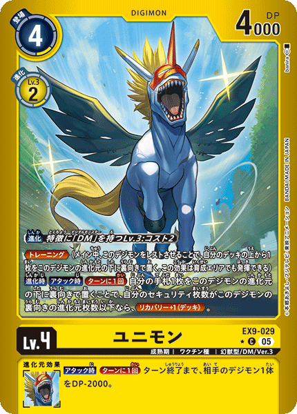 Lv.4 Unimon EX9-029 C Champion | Vaccine | Mythical Beast/DM/Ver.3 [Digivolve] Lv.3 w/[DM] trait: Cost 2 <Training> (In the main phase, by suspending this Digimon, place your deck's top card face down as this Digimon's bottom digivolution card. This effect can also activate in the breeding area.) [When Digivolving] [When Attacking] [Once Per Turn] By placing 1 card in your hand face down as this Digimon's bottom digivolution card, if you have as many or fewer security cards as this Digimon has face-down digivolution cards, <Recovery +1 ≪Deck≫>. --- [When Attacking] [Once Per Turn] 1 of your opponent's Digimon gets -2000 DP for the turn.