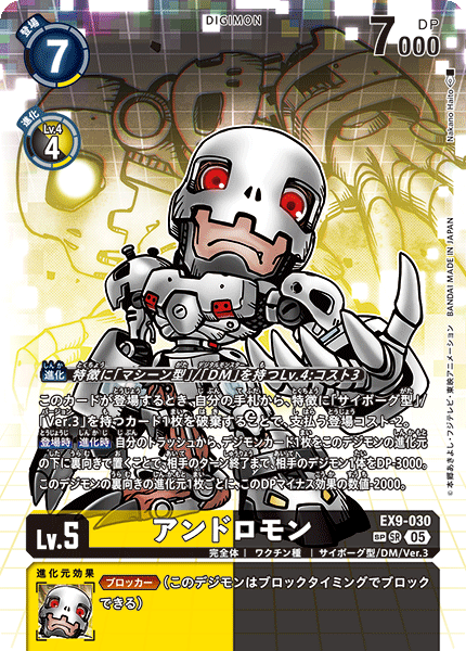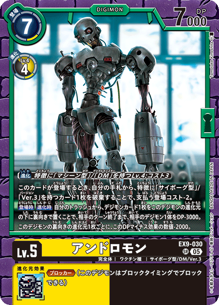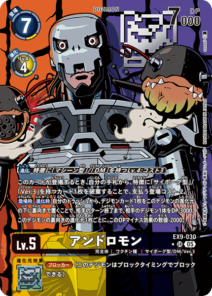 Lv.5 アンドロモン EX9-030 SR 完全体 | ワクチン種 | サイボーグ型/DM/Ver.3 このカードが登場するとき、自分の手札から、特徴に「サイボーグ型」/「Ver.3」を持つカード1枚を破棄することで、支払う登場コスト-2。 【登場時】【進化時】自分のトラッシュから、デジモンカード1枚をこのデジモンの進化元の下に裏向きで置くことで、相手のターン終了まで、相手のデジモン1体をDP-3000。このデジモンの裏向きの進化元1枚ごとに、このDPマイナス効果の数値-2000。 --- ≪ブロッカー≫(このデジモンはブロックタイミングでブロックできる)