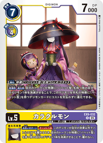 Lv.5 カラクルモン EX9-032 R 完全体 | データ種 | パペット型/リベレイター 【登場時】【進化時】自分のトークンか特徴に「パペット型」を持つ他の自分のデジモン1体を消滅させることで、このデジモンを手札の特徴に「パペット型」を持つデジモンカードにコストを支払わずに進化できる。 --- 【お互いのターン】[ターンに1回]このデジモンが自分の効果以外でバトルエリアを離れるとき、自分のトークンか特徴に「パペット型」を持つ他の自分のデジモン1体を消滅させることで、離れない。