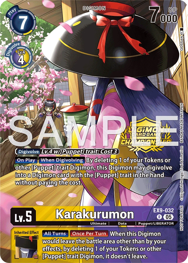 Lv.5 Karakurumon EX9-032 R Ultimate | Data | Puppet/LIBERATOR [Digivolve] Lv.4 w/[Puppet] trait: Cost 3 [On Play] [When Digivolving] By deleting 1 of your Tokens or other [Puppet] trait Digimon, this Digimon may digivolve into a Digimon card with the [Puppet] trait in the hand without paying the cost. --- [All Turns] [Once Per Turn] When this Digimon would leave the battle area other than by your effects, by deleting 1 of your Tokens or other [Puppet] trait Digimon, it doesn't leave.