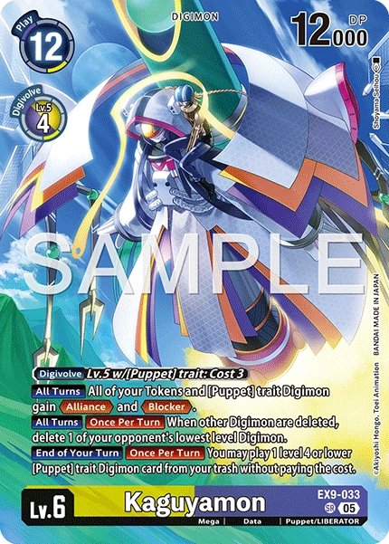 Lv.6 Kaguyamon EX9-033 SR mega | Data | Puppet/LIBERATOR [Digivolve] Lv.5 w/[Puppet] trait: Cost 3 [All Turns] All of your Tokens and [Puppet] trait Digimon gain <Alliance> and <Blocker>. [All Turns] [Once Per Turn] When other Digimon are deleted, delete 1 of your opponent's lowest level Digimon. [End of Your Turn] [Once Per Turn] You may play 1 level 4 or lower [Puppet] trait Digimon card from your trash without paying the cost.