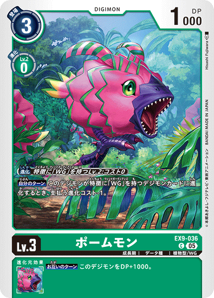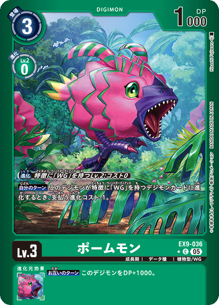 Lv.3 ポームモン EX9-036 C 成長期 | データ種 | 植物型/WG 【自分のターン】このデジモンが特徴に「WG」を持つデジモンカードに進化するとき、支払う進化コスト-1。 --- 【お互いのターン】このデジモンをDP+1000。