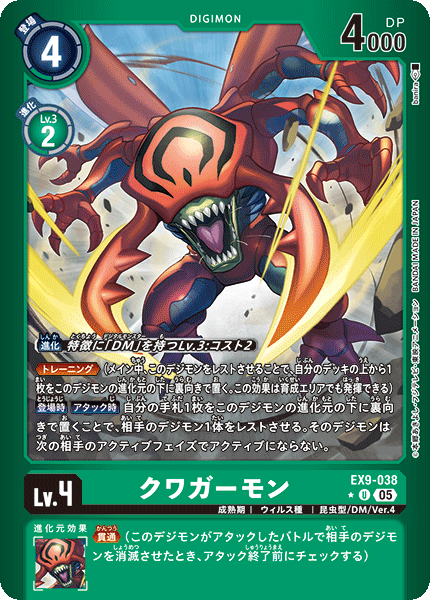 Lv.4 Kuwagamon EX9-038 U Champion | Virus | Insectoid/DM/Ver.4 <Training> (In the main phase, by suspending this Digimon, place your deck's top card face down as this Digimon's bottom digivolution card. This effect can also activate in the breeding area.) [On Play] [When Attacking] By placing 1 card in your hand face down as this Digimon's bottom digivolution card, suspend 1 of your opponent's Digimon. It can't unsuspend in their next unsuspend phase. --- <Piercing> (When this Digimon attacks and deletes your opponent's Digimon in battle, it checks security before the attack ends.)