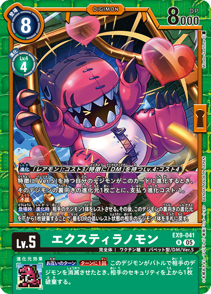 Lv.5 ExTyrannomon EX9-041 R ultimate | Vaccine | Puppet/DM/Ver.5 [Digivolve] [Raremon]: Cost 3 [Digivolve] Lv.4 w/[DM] trait: Cost 4 When any of your [Ver.5] trait Digimon would digivolve into this card, for each of their face-down digivolution cards, reduce the digivolution cost by 1. <Fortitude> (When this Digimon with digivolution cards is deleted, play this card without paying the cost) [On Play] [When Digivolving] Suspend 1 of your opponent's Digimon. Then, by trashing this Digimon's bottom face-down digivolution card, return 1 of your opponent's suspended Digimon with the lowest DP to the hand. --- [All Turns] [Once Per Turn] When this Digimon deletes your opponent's Digimon in battle, trash their top security card.