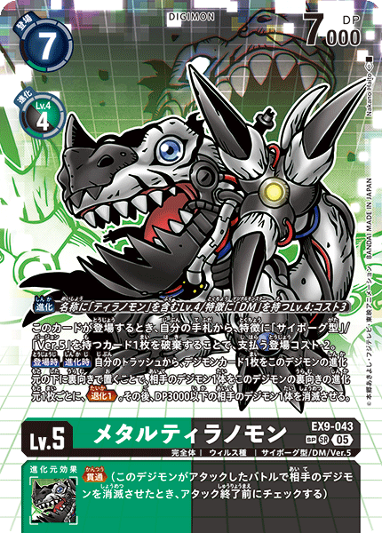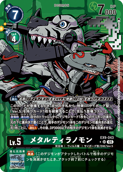 Lv.5 メタルティラノモン EX9-043 SR 完全体 | ウィルス種 | サイボーグ型/DM/Ver.5 このカードが登場するとき、自分の手札から、特徴に「サイボーグ型」/「Ver.5」を持つカード1枚を破棄することで、支払う登場コスト-2。 【登場時】【進化時】自分のトラッシュから、デジモンカード1枚をこのデジモンの進化元の下に裏向きで置くことで、相手のデジモン1体をこのデジモンの裏向きの進化元1枚ごとに、≪退化1≫。その後、DP3000以下の相手のデジモン1体を消滅させる。 --- ≪貫通≫(このデジモンがアタックしたバトルで相手のデジモンを消滅させたとき、アタック終了前にチェックする)