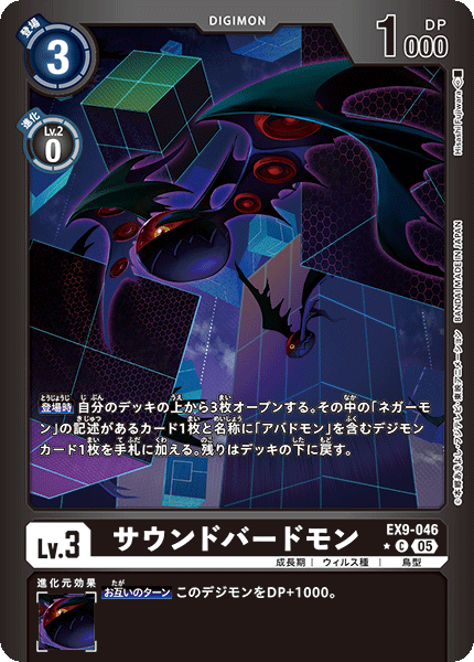 Lv.3 サウンドバードモン EX9-046 C 成長期 | ウィルス種 | 鳥型 【登場時】自分のデッキの上から3枚オープンする。その中の「ネガーモン」の記述があるカード1枚と名称に「アバドモン」を含むデジモンカード1枚を手札に加える。残りはデッキの下に戻す。 --- 【お互いのターン】このデジモンをDP+1000。
