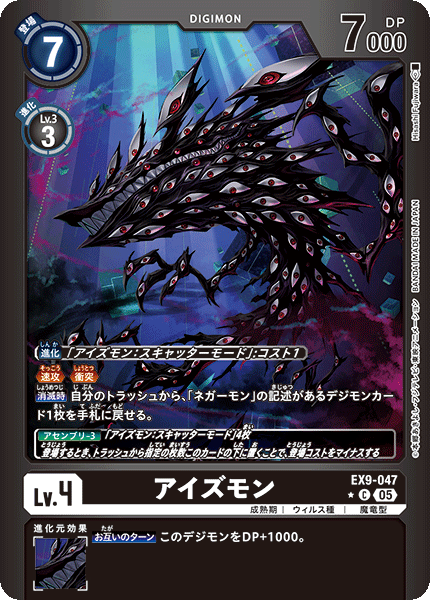 Lv.4 アイズモン EX9-047 C 成熟期 | ウィルス種 | 魔竜型 ≪速攻≫≪衝突≫ 【消滅時】自分のトラッシュから、「ネガーモン」の記述があるデジモンカード1枚を手札に戻せる。 --- 【お互いのターン】このデジモンをDP+1000。